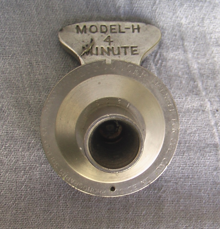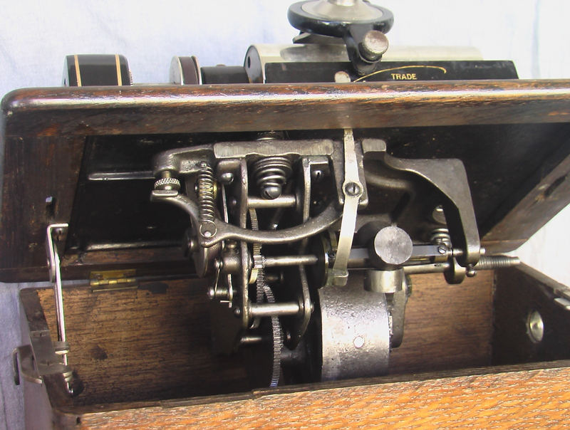 Unlike the Columbia Eagle cylinder machine found in the collection, most of the operational machinery of Edison cylinder players, including the Standard Model D, is located in its box-shaped case, out of sight on the bottom side of the case’s top board. Only the phonograph’s mandrel, its drive screw, its reproducer and carriage and guides, and part of its motor’s belt are visible when in operation. Beneath the top board is to be found the spring motor, the governor, most of its gearing, and the other half of the drive belt that transmits the power produced by the motor to the mandrel on the top side of the wood case (detail #4). The spring motor, which needs to be wound up before the playing of each 4-minute cylinder, is prepped by turning clockwise the removeable hand crank (detail #5) that protrudes from one side of the phonograph’s case. The top board of the case is hinged at the top of the case’s back sideboard and can be propped open with the aid of a metal support so that the underneath mechanical parts can be reached for lubrication and repair (detail #4). The carriage that houses the phonograph’s glass-tipped reproducer/stylus moves along the length of a 4-minute cylinder mounted on the mandrel at a controlled pace of 200 phonogram grooves per inch as the mandrel rotates at a standardized speed of 160 revolution per minute. All this precision is controlled by: a) the governor, which regulates the energy output of the spring motor; and 2) gearing and the drive belt, which collectively coordinate the rate of rotation of the phonograph’s mandrel and the drive screw that controls the rate at which the reproducer carriage moves laterally along the length of the cylinder. The mechanics of the machine can be switched from playing 2-minute cylinders to playing 4-minute cylinders by pushing in (for 2-minute cylinders) or pulling out (for 4-minute cylinders) a sliding stub located on the side of the gear cover located on the left side of the phonograph’s top board (detail #6 shows the gear cover attached; detail #7 the gear cover removed). One small cone-shaped horn came with the phonograph; it slides onto a shaft at the back side of the reproducer (gallery #1). When not in use, the horn and motor crank are removed and an arched wooden cover is placed over the instrument’s box-shaped case and locked in place with latches on the sides of the case (gallery #2).