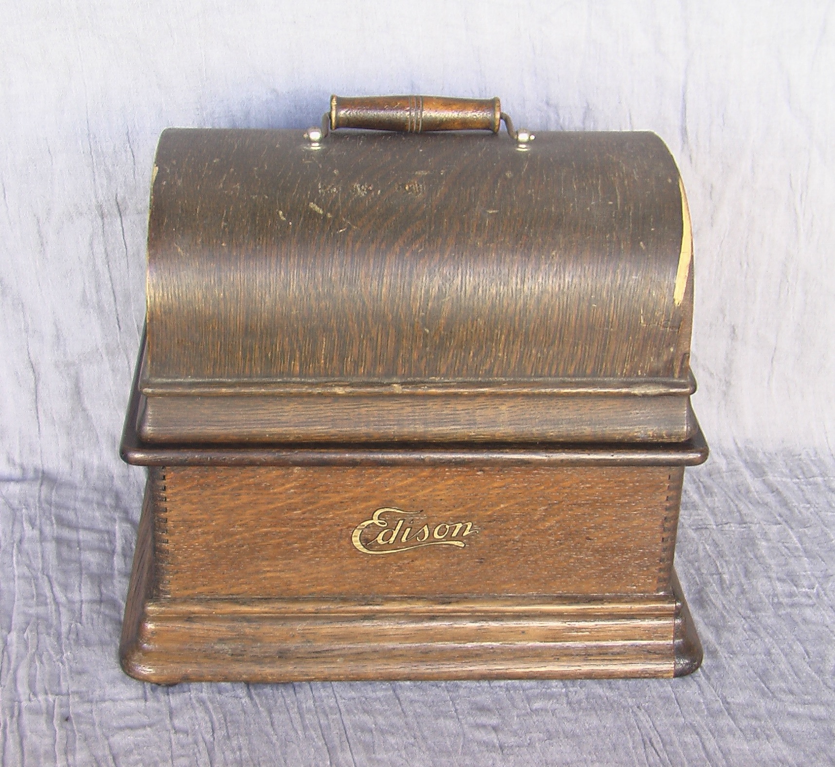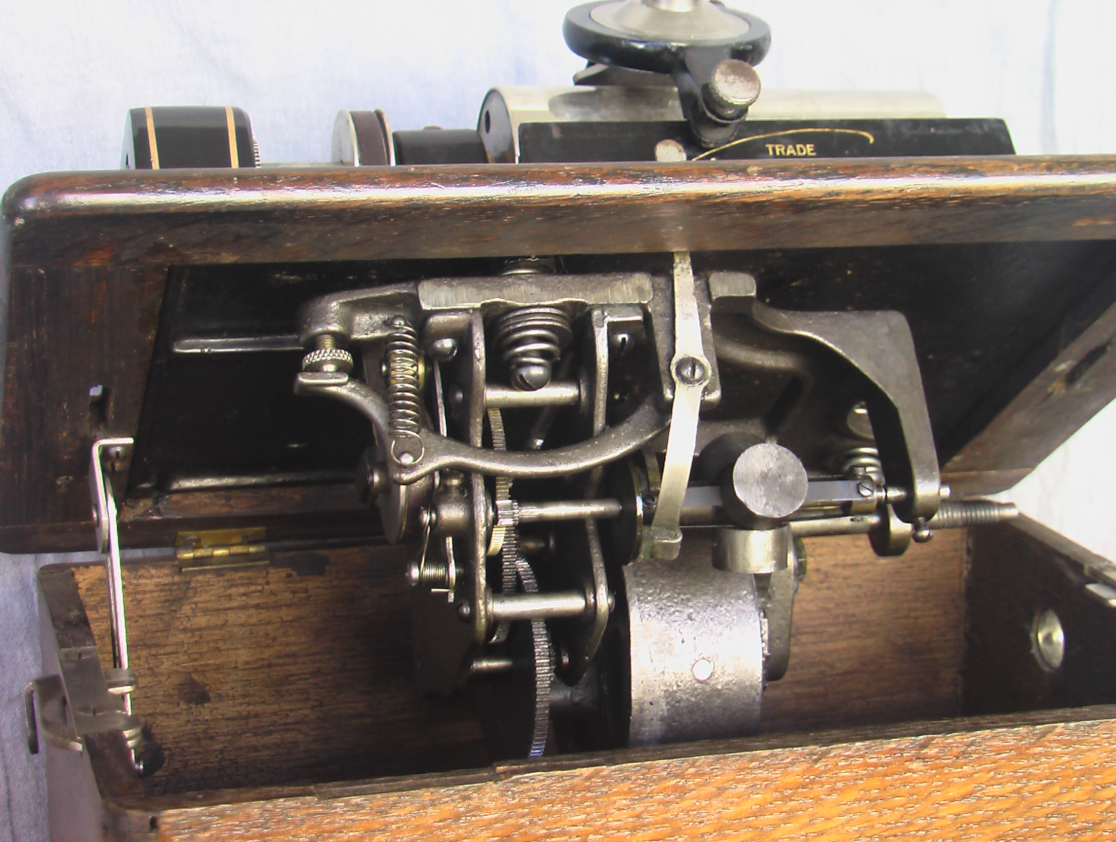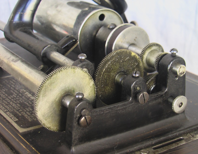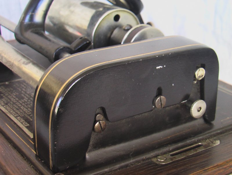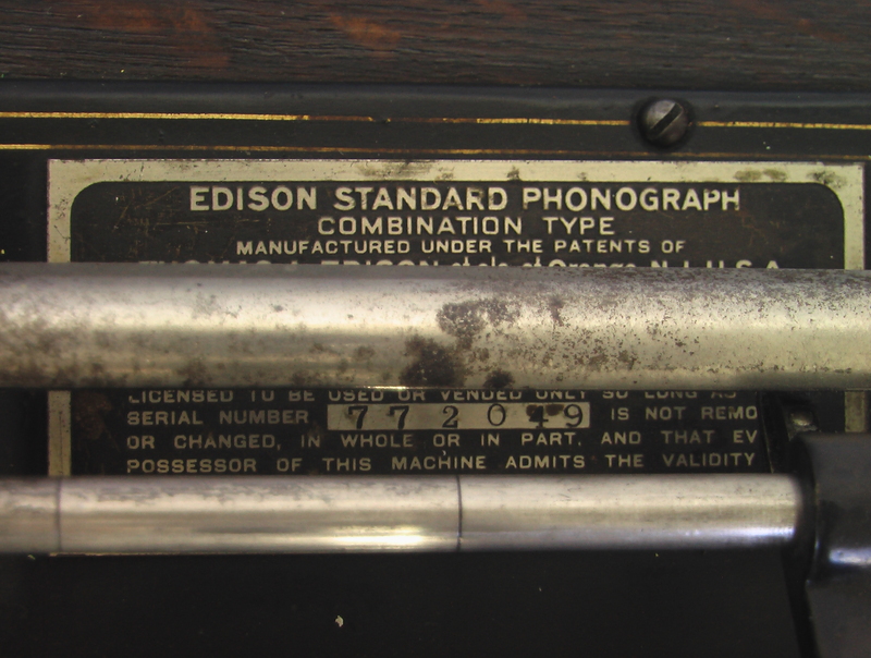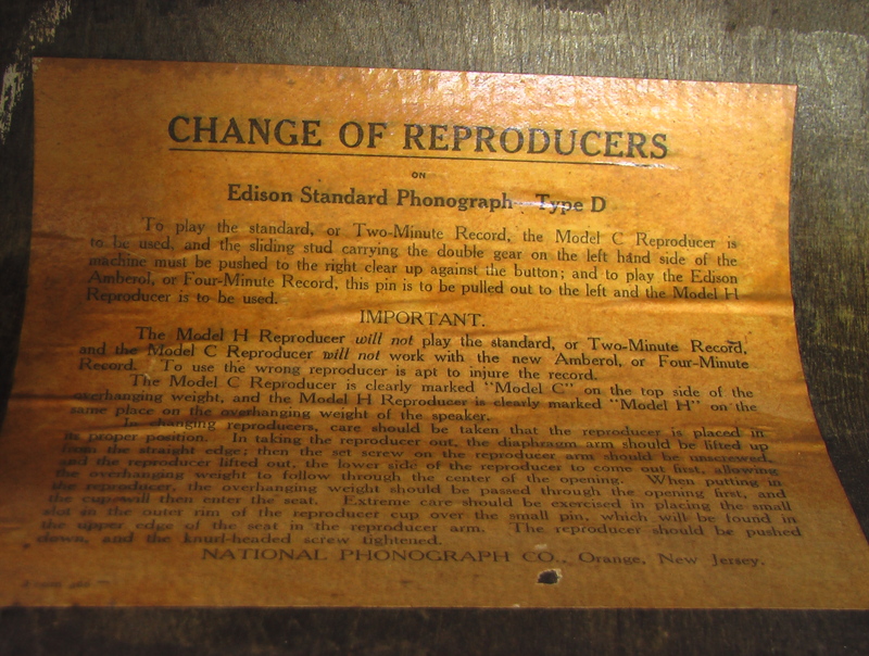This Edison Standard Model D cylinder phonograph is a totally mechanical (non-electrical) acoustic stylusphone idiophone designed and made in the U.S.A between 1908 and 1911 but also introduced to Europe and elsewhere in the world. The initial Edison Standard phonograph was introduced in 1898 but subsequent models of it introduced small mechanical and decorative changes. From the copyright information found on the ID plate of this instrument (detail #1), it was possibly manufactured in 1908. The first Standard phonographs cost $20.00 in 1898 while subsequent models, such as the one pictured here, cost $30 when new. Whether its price was $20 or $30, it was unaffordable for much of the American population of the time. The Standard Model D was the first Edison phonograph to give its user the option to play either 2- or 4-minute cylinders. In order to do this, the phonograph, when new, came with two interchangeable reproducers (a Type C, used when playing 2-minute cylinders, and a Type H [detail #2, reproducer removed from its carriage], used when playing the new [in 1908] 4-minute cylinders) and with newly designed gearing that allowed the user to change the rate at which the reproducer carriage moved along the length of the cylinder being played (from traversing 100 grooves per inch for 2-minute cylinders to 200 grooves per inch for 4-minute cylinders). Clear instructions as to how to set up the phonograph to be play either 2- or 4-minute cylinders is still found inside the machines arched-top cover (detail #3). When the individual who donated this Edison Standard Model D to Grinnell College purchased it from an antique shop around 2005, the phonograph had only its Type H reproducer, so it has since then been used only to play 4-minute cylinders.