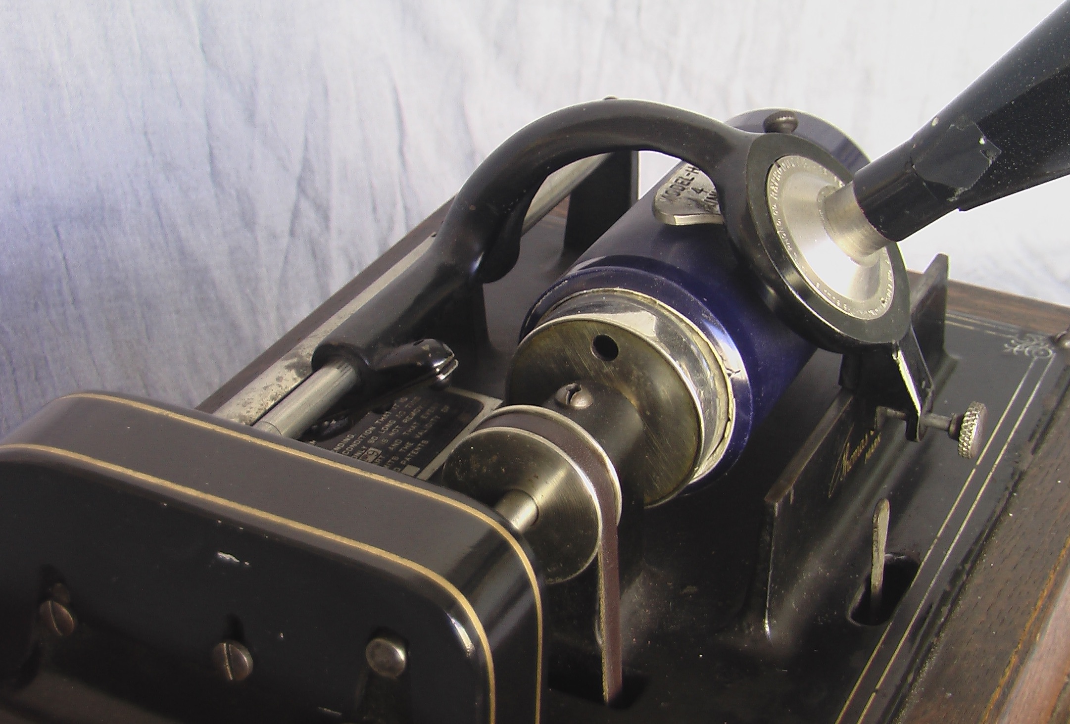 The player takes a 4-minute cylinder and slides it onto the phonograph’s mandrel while the sound box carriage (including its attached horn) is at its raised position and so that the starting point of the phonogram’s groove is situated near the phonograph’s drive belt. The player then uses the motor’s crank to fully wind up the enclosed spring while the machine’s on-off switch is in the off position. When ready to play the chosen phonogram, the operator slides the main switch to the ‘on’ position and the governor, gearing, mandrel, and sound box feed screw all start rotating. The operator then slides the soundbox carriage to over the left end of the cylinder and lowers the soundbox until one end of it contacts the drive screw and the stylus end comes in contact with the surface of the rotating cylinder (detail #8). The soundbox/stylus/horn then start to move along the length of the cylinder at a consistent pace (covering 200 passes through the groove spiral per inch of cylinder while rotating at 160 times per minute). When the performance captured on the cylinder comes to an end, the player lifts the stylus and soundbox off the cylinder, slides it all the way to the left, and turns the motor off before removing the cylinder from the mandrel.