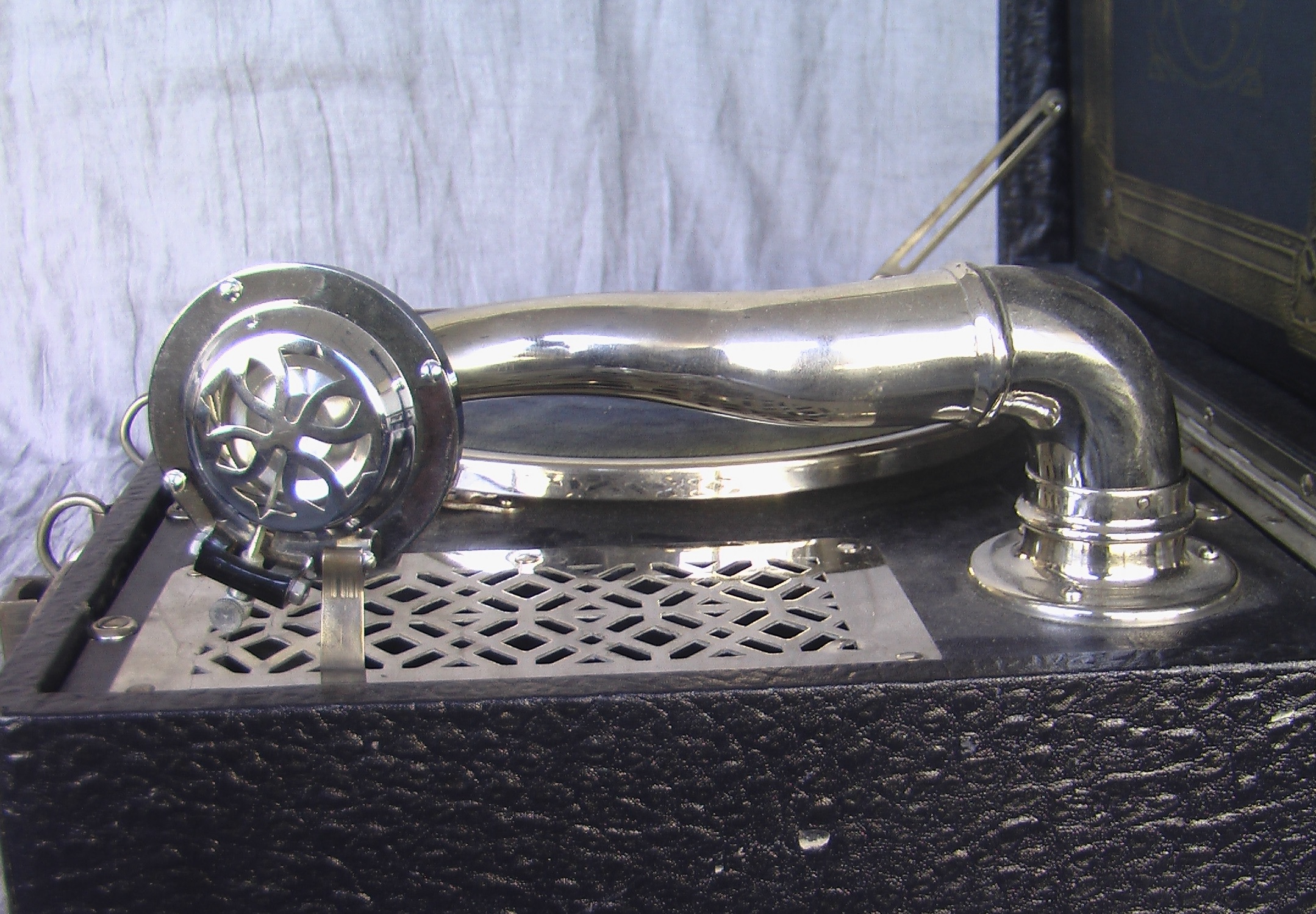 112.511.2 idiophone--stylusphone with pointed metal stylus, reproduction directed by internal acoustical horn: the sound of the membrane transducer is directed and heard through an acoustical horn located inside the phonograph