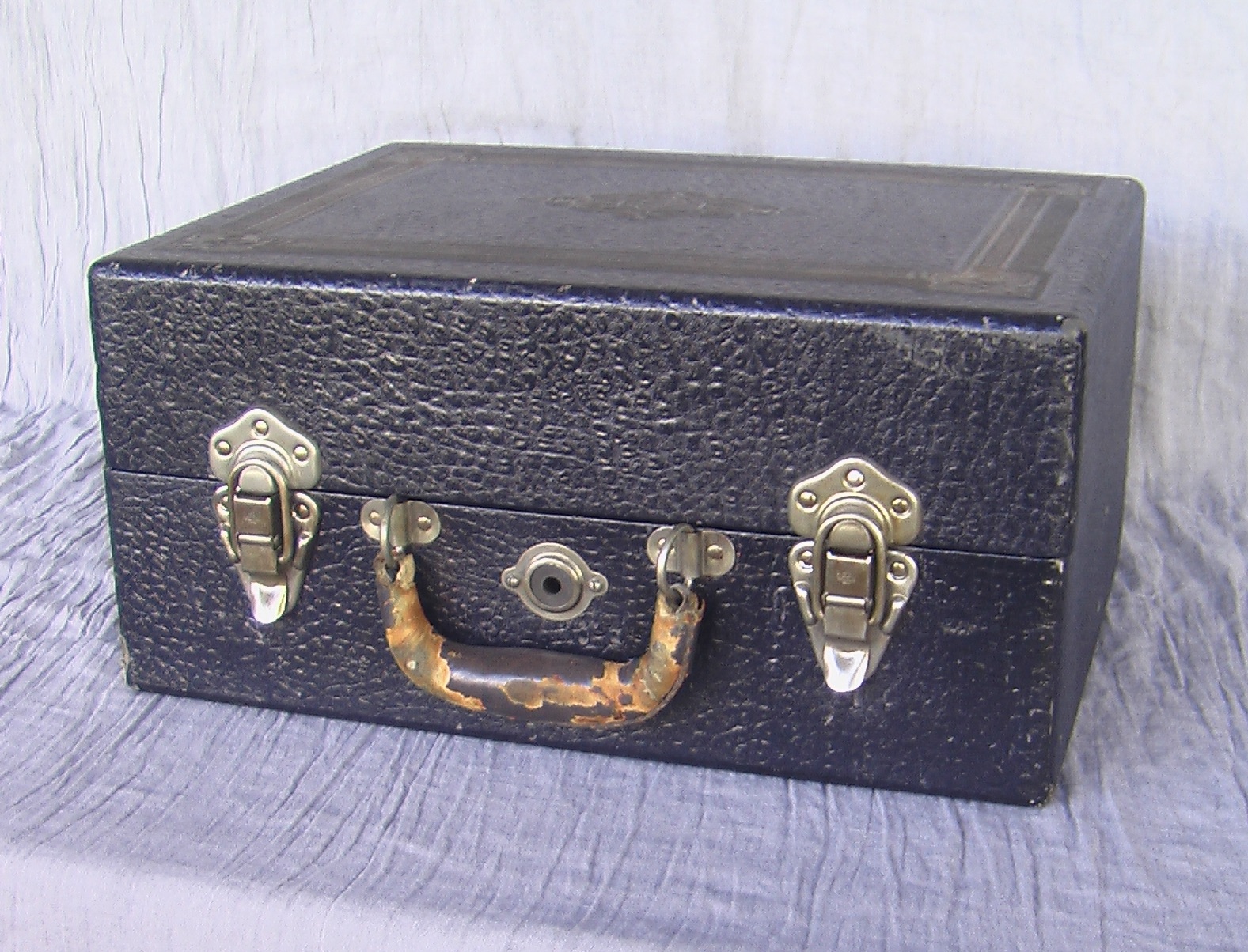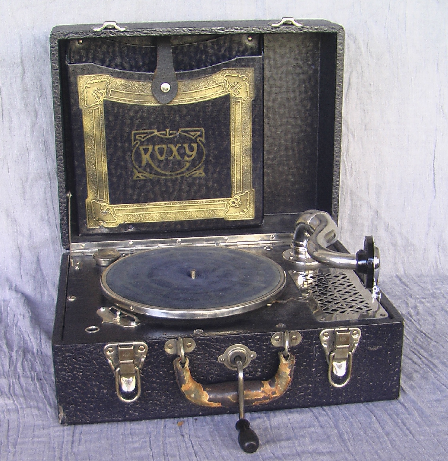 This Roxy portable disc phonograph is a mechanical stylusphone idiophone with an internal horn designed and manufactured probably in the U.S.A. in the 1920s. It is an off-brand machine--the actual manufacturer of the Roxy is not known and there is no known Roxy phonograph company. Rather, this machine was most likely made by an independent manufacturing company that would customize its products to the wishes of its customers who themselves were businesses such as department or furniture stores. While some phonograph manufacturers started producing portable disc record players in the 1910s, the 1920s was the decade in which the development of portable machines really took off. The Roxy is an excellent example of 1920s phonograph design innovation emphasizing portability; machines such as the Roxy are sometimes referred to as “suitcase” phonographs. The Roxy is capable of playing 78rpm discs of any diameter up to 12 inches. The video clip on this page shows the Roxy phonograph playing a 10-inch, 2-sided, 78rpm disc.