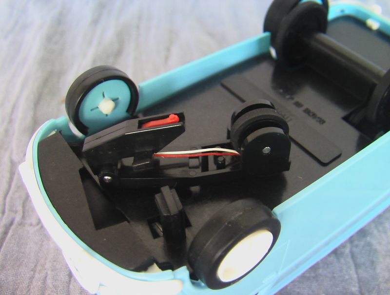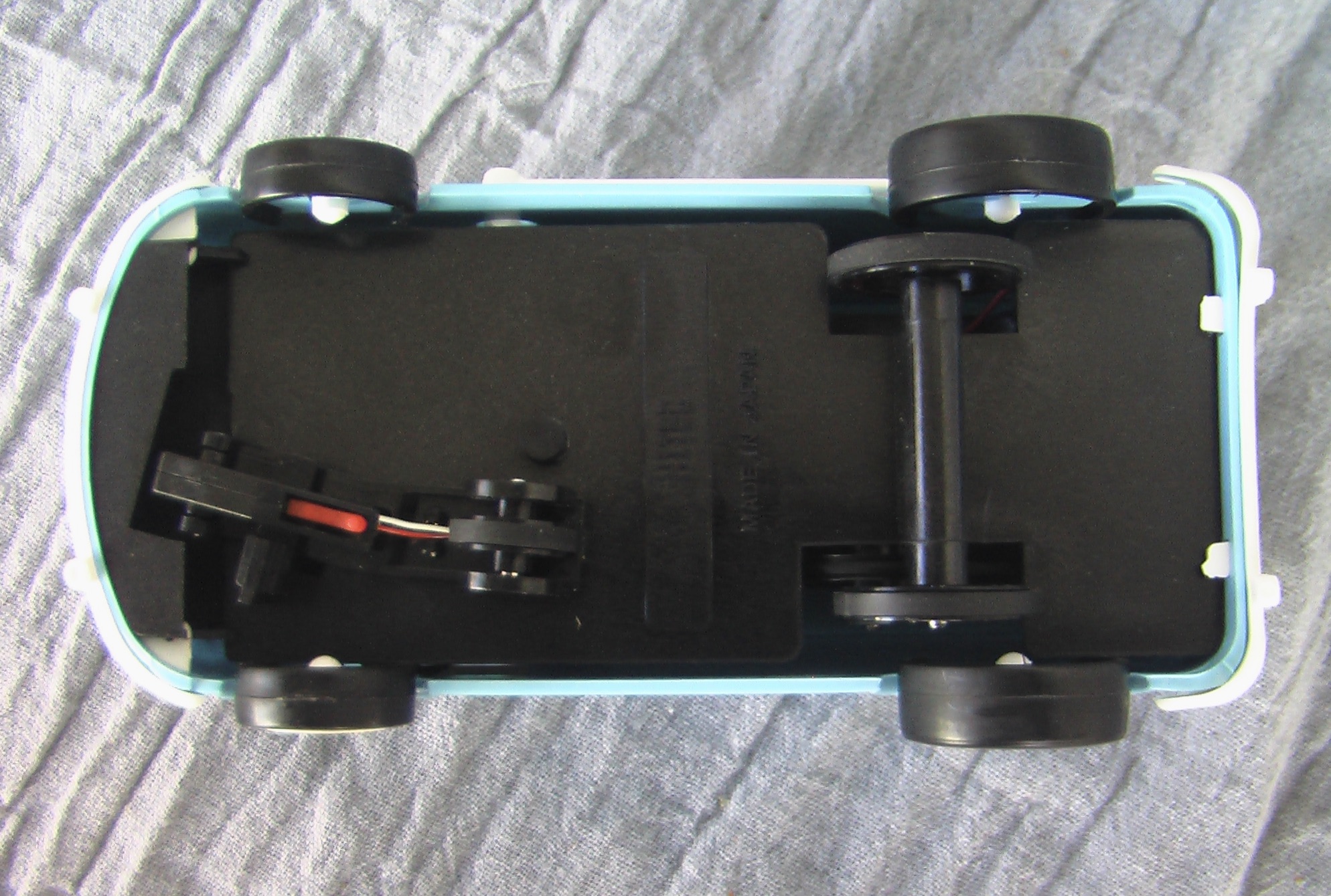Place either a monaural or stereo 33-1/3rpm disc on a flat surface (such as a tabletop). If not already provided with a 9-volt battery, insert one through the van’s rear door (details #2 and #3). Release the stylus carriage from its storage hook (detail #4 shows the stylus carriage attached to the storage hook), rotate the power switch to its ‘on’ position, and place the Soundwagon on the record so that it moves counterclockwise around the disc it is playing (video clip). It has no controls for volume, tone, or speed. When the operator is finished listening to the contents of the phonogram, the phonograph is lifted off the record and the power switch is moved to its ‘off’ position.