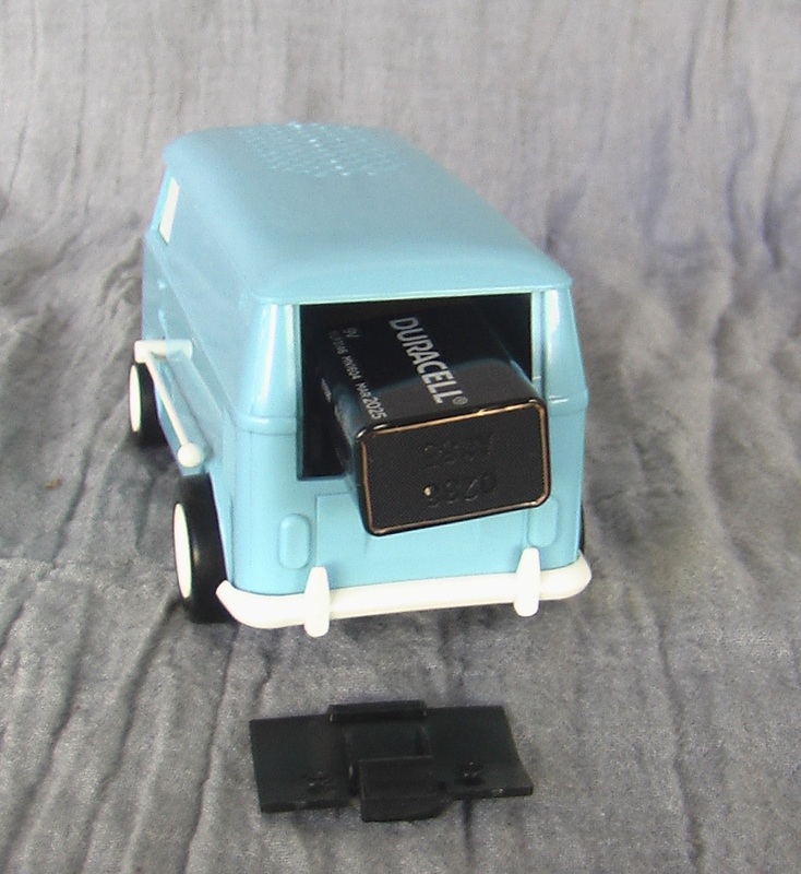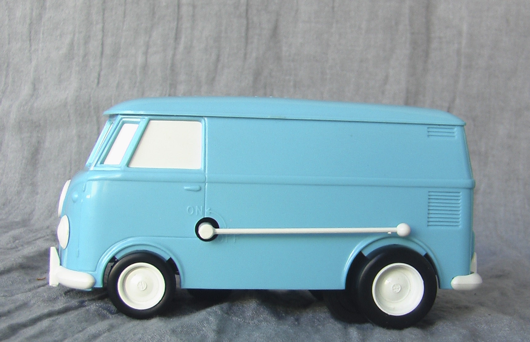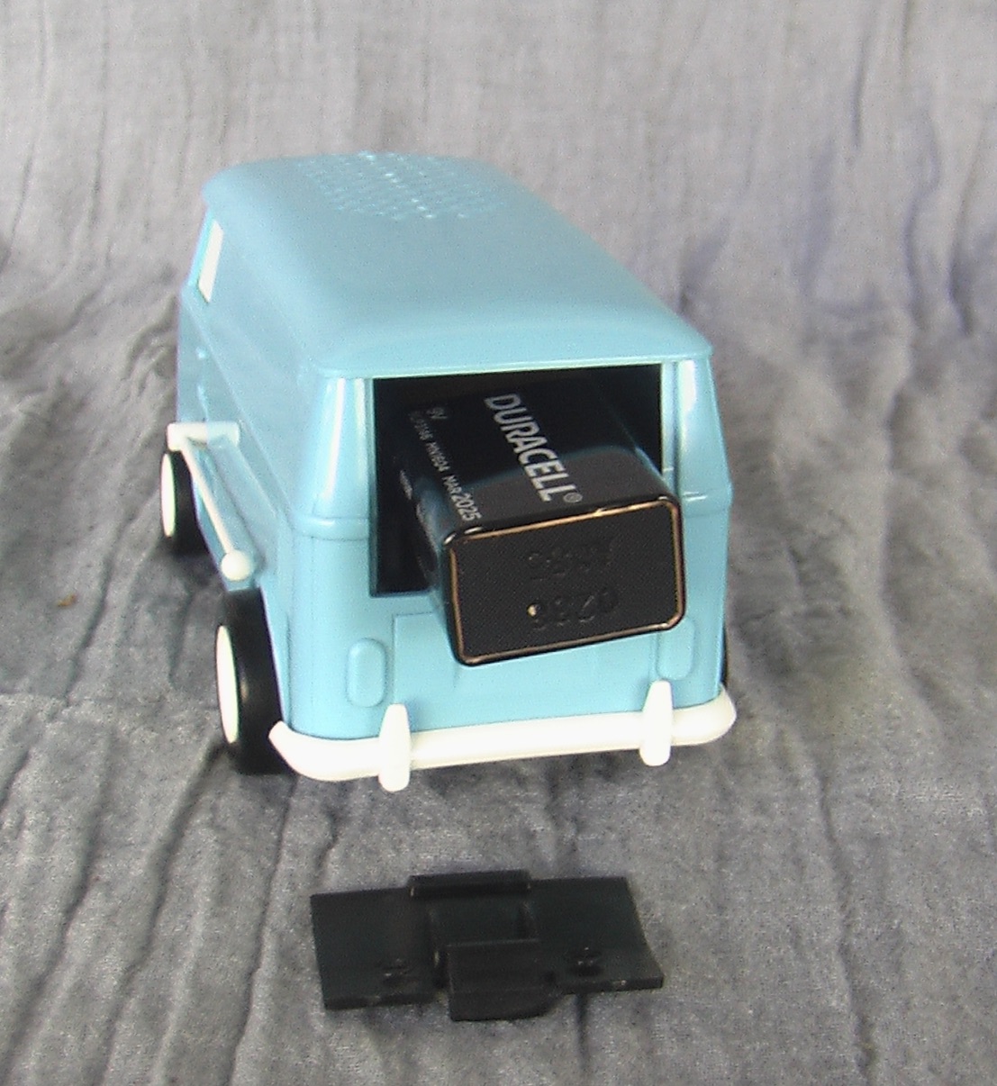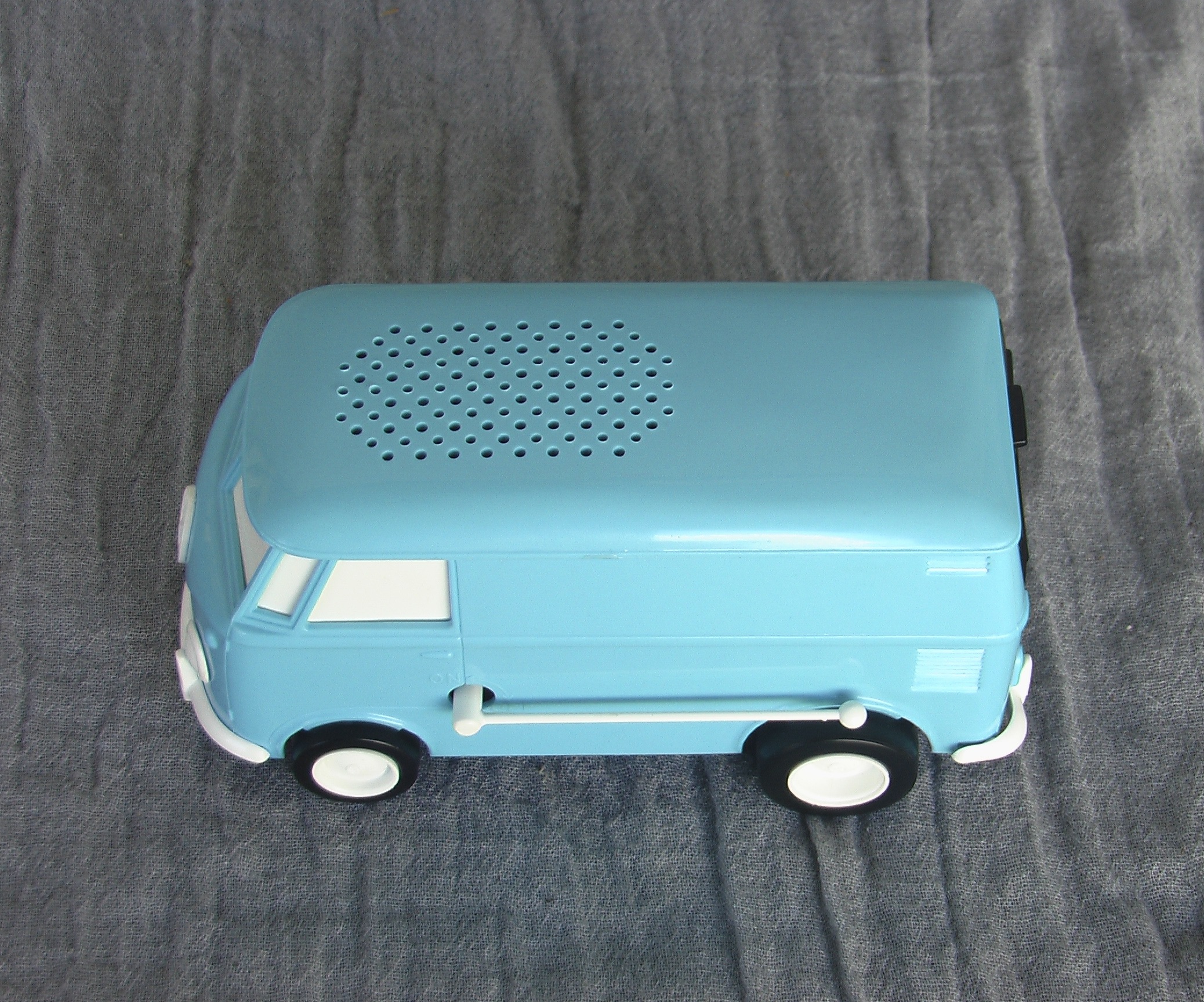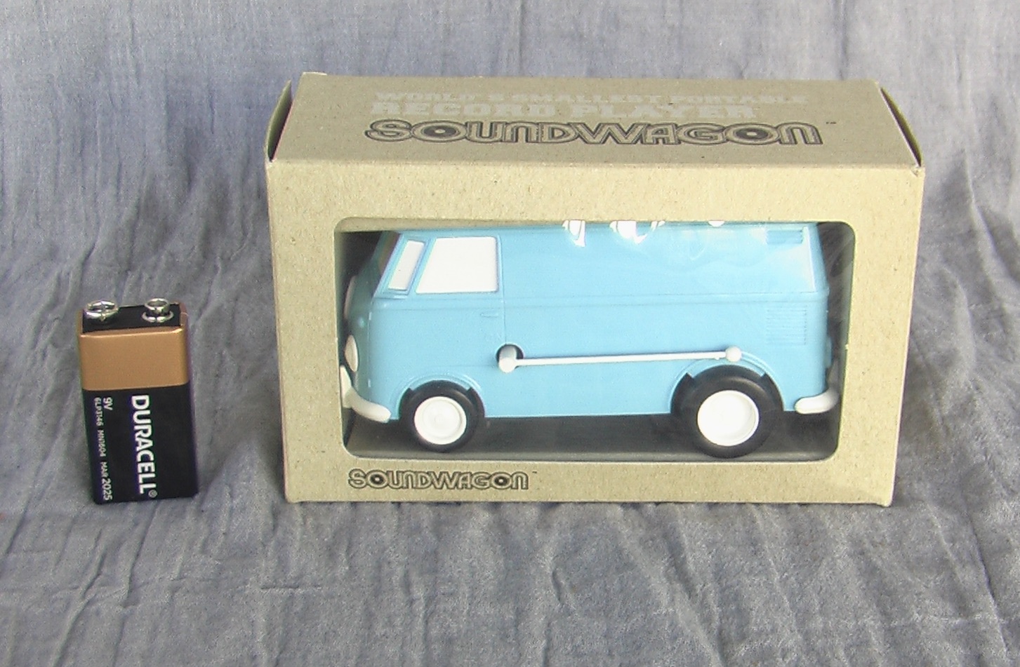 The Soundwagon phonograph is an electro-acoustic idiophone stylusphone designed and manufactured in Japan but distributed and sold widely throughout the world. Shaped like a Volkswagen campervan (this likeness is officially licensed by Volkswagen), this Soundwagon can be used only to play 33-1/3rpm micro-groove disc records. It is a monaural phonograph (stereo records can be played by it, but as though they are monaural records). Although the word “toy” is sometimes used in writings about this phonograph, the manufacturer (Stokyo Co., Ltd.) warns the purchaser of this phonograph that it is not a toy and that it is “not recommended for children” (bottom of packaging box). The manufacturer pitches the phonograph as “a unique record player unlike anything seen before. While an ordinary phonograph player rotates the vinyl, the ‘Soundwagon’ propels itself around the record, playing music from it’s [sic] own built in Speaker! Whether for record playing, amusement, vinyl digging at garage sales or record stores, the ‘Soundwagon’ is your perfect mobile record player” (bottom of packaging box). It is, indeed, mobile, for it runs on a single 9-volt battery rather than having to be plugged into a wall socket.